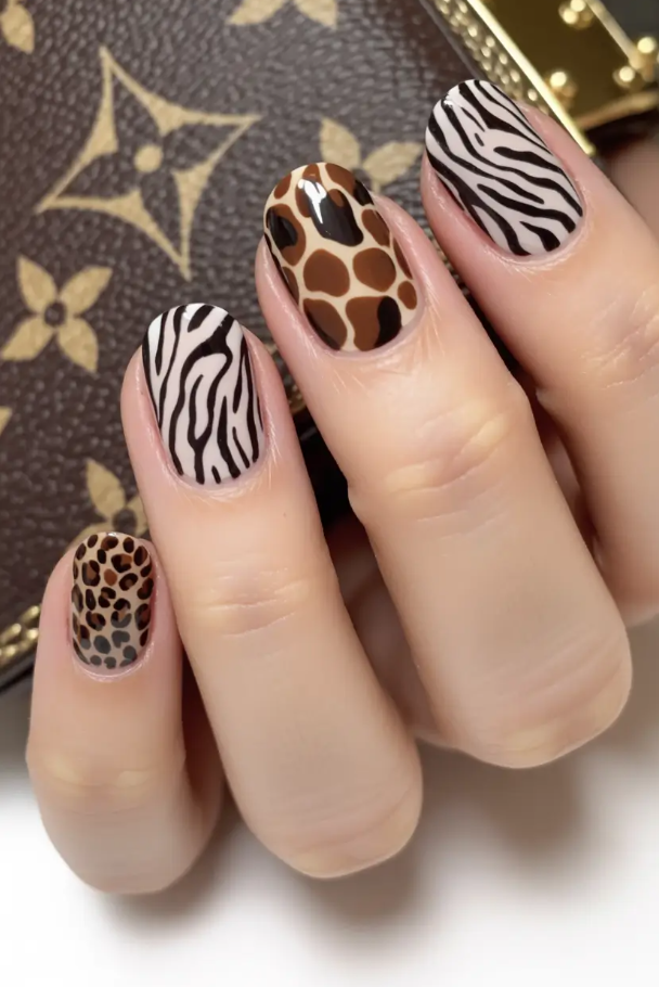 What you need to know: animal print is all really neutral, animal nuthing special, this fall 2025. This crazy mashup is filled with zebra, giraffe, and leopard patterns on different fingers — an entire editorial for the style-addicted who want designs that are autumnally chic, but with a fashion-week twist. It’s fearless, fun, and surprisingly wearable in shorter lengths.