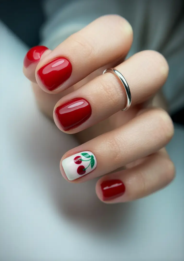 I reserve a particular fondness in my heart towards red nails, and given the fact that it is especially in their bold, sanitary, and with a playful twist, I have a particular fondness towards them. The look leaves it fresh with a true red color on the majority of nails and a pop accent color of the small hand-painted cherries. It’s giving 2025 red meets “hot girl autumn.”