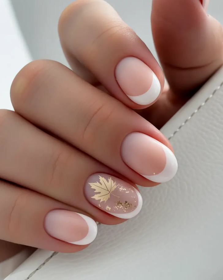 This one is minimalist, but with some twist. An old-school French mani on short fall nails, softly rounded, muted pink with sheer delicate white tips. Then boom a golden maple leaf and loose glitter powder on a finger adds the right amount of designs fall energy to make it seasonal, not basic.
