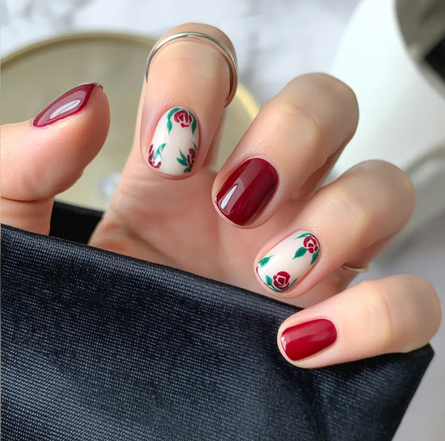 There’s timeless, and then there’s this. A glossy red that is almost verging on maroon combines with micro roses on a cream nude foundation- imagine a Vintage wallpaper, but with a bad girl vibe. It’s sweet but confident, charming without being cutesy. The combination is the fall version of romantic nails that do not fall too heavily into the summer-soft territory.