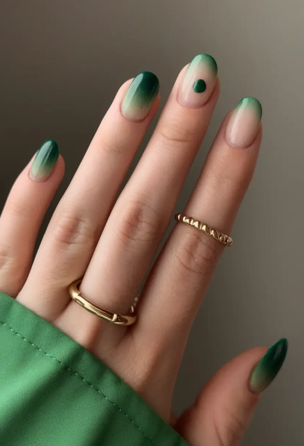 This effect gives an impression of a walk through fall woods immediately after the rain–a greenish gradient ascending from the cuticle in the morning fog. One of the nails features one emerald dot to add the minimal touch of a twist and bring the entire design up a notch. It is a visual deep exhale, straightforward, clean and one hundred percent ready to be the trends of 2025.