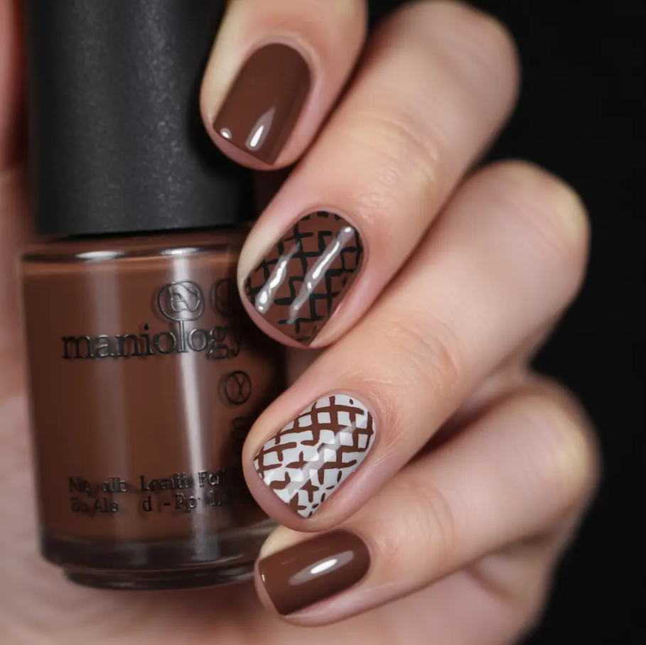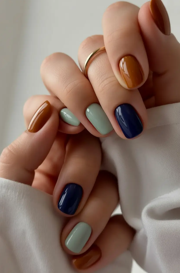 This one’s giving vintage varsity jacket energy — and I’m obsessed. The mix of mustard, muted mint and navy with an earthy terracotta brown is a great twist on a color offshoots that are at once vintage and current. It’s fun, 2025 green adjacent and way too unexpected for short fall nails.