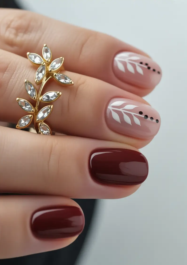 This duo is an automatic mood: short fall nails that have a graphic, artistic hit. A pale blush foundation that has white leaf lines and spots allows contrast with a vampy merlot red. The classy style is grounded by the minimalist designs and the details but ? Totally extra.