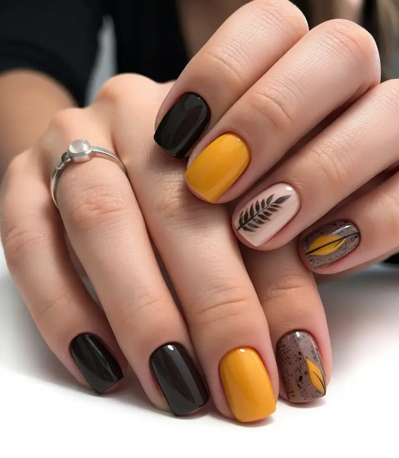 This set feels like fall distilled into nail art. Warm brown, sunny mustard, nude with black leaf graphics, and speckled gray with gold detailing — it’s moody but light-hearted, earthy yet refined. This is one of the most solid 2025 simple appears that yet has the capacity to convey and narrate.