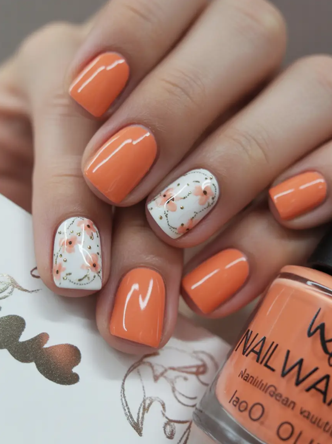 This floral softness veers into 2025 simple, and glitches out a touch of daydream. Nails are a warm peachy orange that serve as a background to fragile flower designs created in faded pinks and browns-with only a touch of gold. The combination is airy and trans-seasonal and is great in early fall when the air is cooler yet the sun is heating your face.
