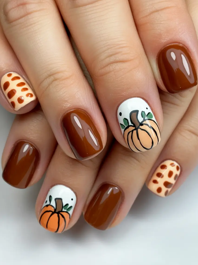 How can it not be fall without one or more short fall nails looks dedicated to pumpkins? It is sweet and inviting but not really cartoonish in such a way that we have attaching warm caramel-brown color, hints of adorable pumpkin pictures and cozy speckled-patterned decor. It is adorable, and holiday-themed, and perfectly suited to that sweet spot in-between Halloween and the sweater weather of November.