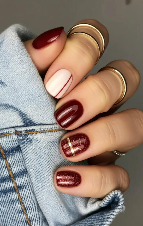 Get a mani that’s really the nail version of your favorite fall sweater. Deep gray, wine red, classic navy and a black glitter accent – it’s strong, wearable and on trend with the 2025 outlook, which is all about tone-blocking with just a hint of sparkle. Each finger feels distinct but still coordinated.