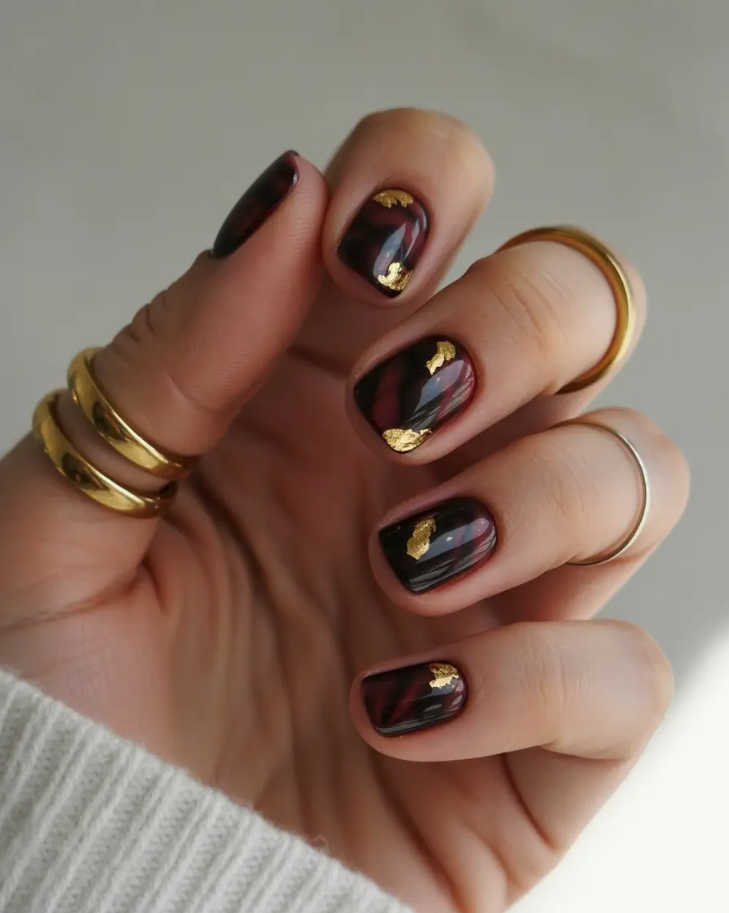 These nails are practically made for November nights. Imagine rich black cherry and eggplant hues with a smudgy translucent one that pulls you in. Next, there’s drama: crinkled gold foil, strewn senselessly around the border. It’s hot, classy, and, unmistakably 2025 design – big style, low maintenance.